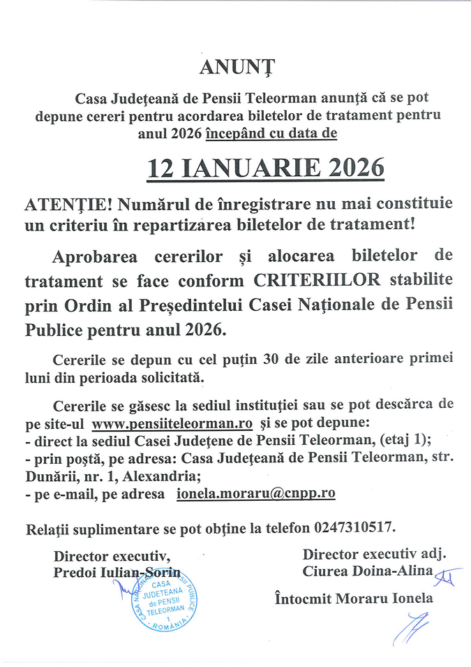Pentru informații suplimentare vă rugăm să vă adresați Casei Județene de Pensii Teleorman – Compartimentul Gestiune Bilete de Tratament sau să consultați site-ul oficial www.pensiiteleorman.ro, secțiunea Bilete de Tratament.